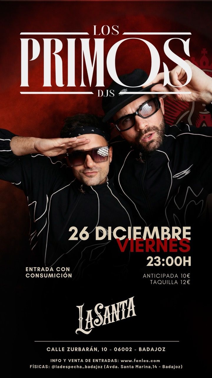 El viernes 26 de diciembre de 2025, prepárate para una noche inolvidable con Los Primos DJs en La Santa (Badajoz). A partir de las 23:00 h, esta fiesta navideña promete baile, diversión y buena música en una de las salas más icónicas de la ciudad. Entrada con consumición incluida. Precio anticipado 10€, taquilla 12€. ¡No te lo pierdas! ⚠️No se admiten devoluciones⚠️ 🔞Mayores de 18 años 🔞 ‼️Se reserva el derecho de admisión‼️