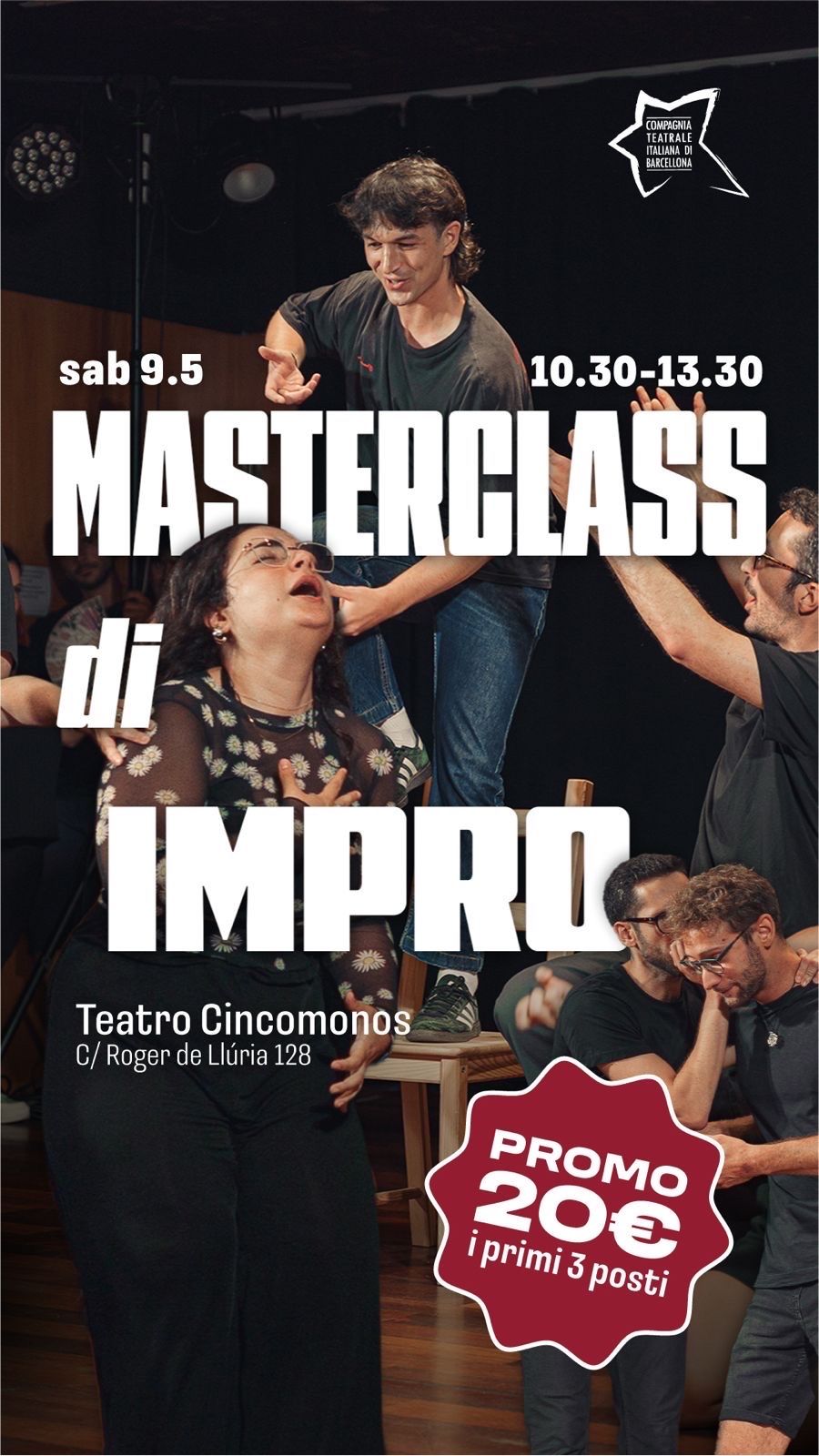 Un'occasione per mettersi alla prova, uscire dalla comfort zone e scoprire cosa succede quando non c'è copione. Che tu sia alle prime armi o abbia gia esperienza, questa masterclass è pensata per chi vuole provare, migliorare e divertirsi sul momento. Improvvisare significa ascoltare, reagire, lasciarsi sorprendere. E soprattutto... non sapere cosa succederà 17 Sabato 9 maggio • 10:30 - 13:30 • Teatro Cincomonos - C/ Roger de Llúria 128 { Promo: 20€ i primi 3 posti 25€ gli altri