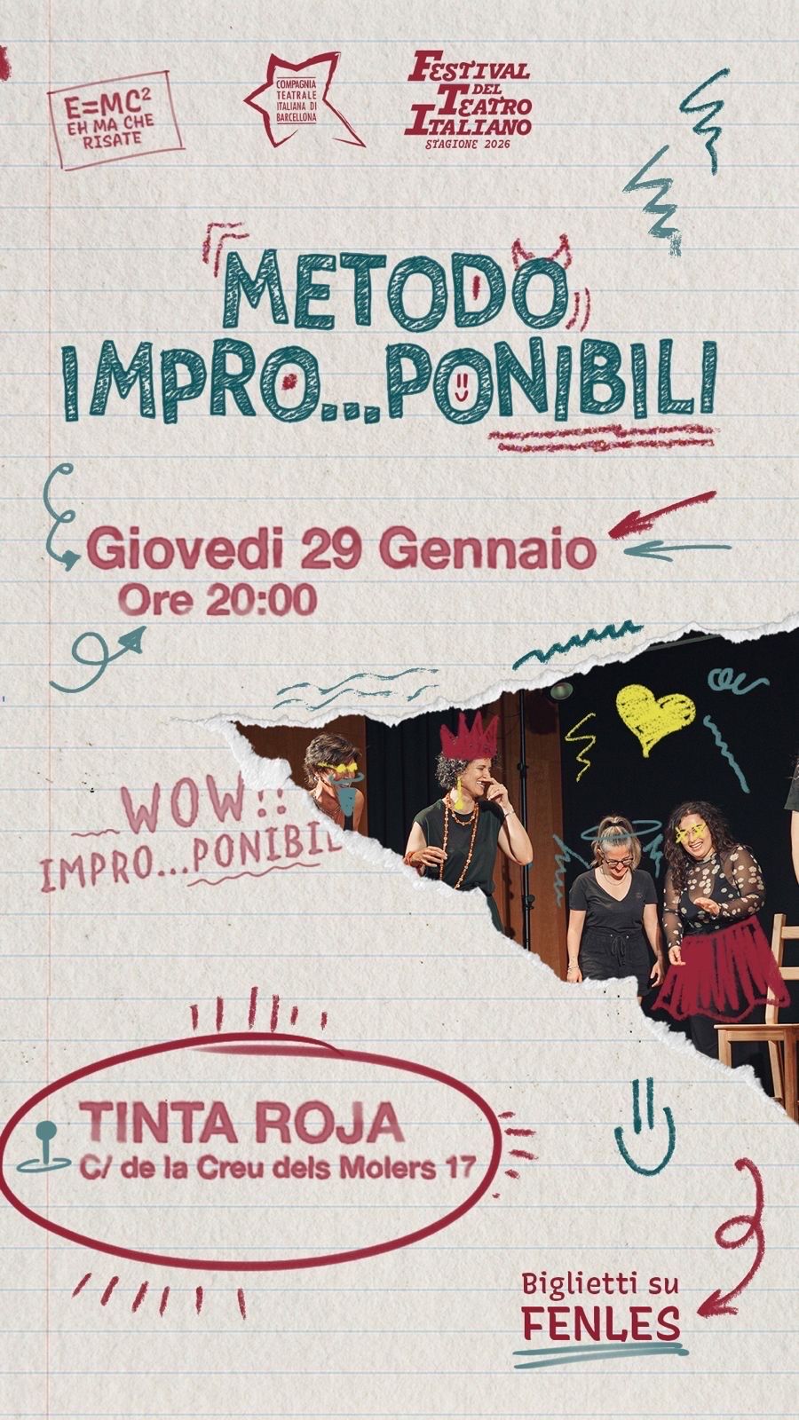 Metodo impro…ponibili è uno spettacolo di improvvisazione teatrale dove nulla è previsto e tutto può accadere. La compagnia teatrale italiana di Barcellona porta in scena un’esperienza di improvvisazione pura. Suggestioni, parole e situazioni nate sul momento vengono trasformate in scene esilaranti, surreali e imprevedibili. Un gioco teatrale collettivo, fatto di ascolto, ritmo e complicità, dove l’errore diventa risorsa e la risata è inevitabile. Uno spettacolo unico, irripetibile e decisamente… improponibile.