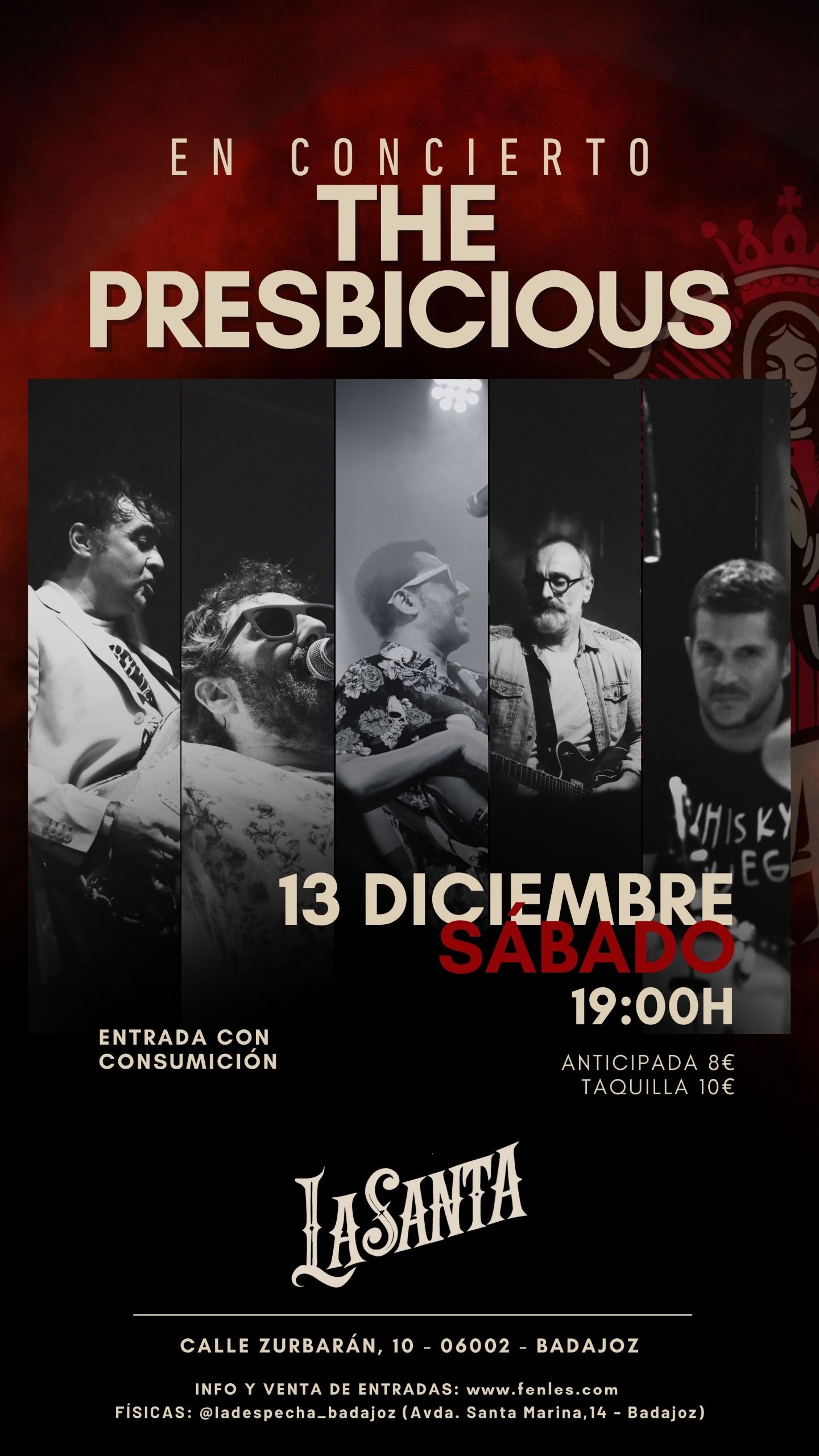 La banda THE PRESBICIOUS se presenta en directo en la sala La Santa de Badajoz con un espectáculo vibrante. El sábado 13 de diciembre, a partir de las 19:00 h, este grupo hará un recorrido de versiones únicas que mezclan pop, rock y grandes himnos. La sala La Santa (Calle Zurbarán 10, 06002 Badajoz) ofrece entrada con consumición anticipada a 8 €, taquilla 10 €. ¡Una noche ideal para disfrutar de música en directo y buen ambiente en la ciudad! No te lo pierdas.